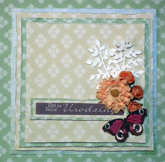 Inspiracja Tami jest naprawdę wyjątkowa - kartka jest w rozmiarze 30x30 :) - ponieważ spełniać ma szczególną rolę. Tami wykorzystała motylka z tektury, kawałek koronki, mulinę i serwetkę.